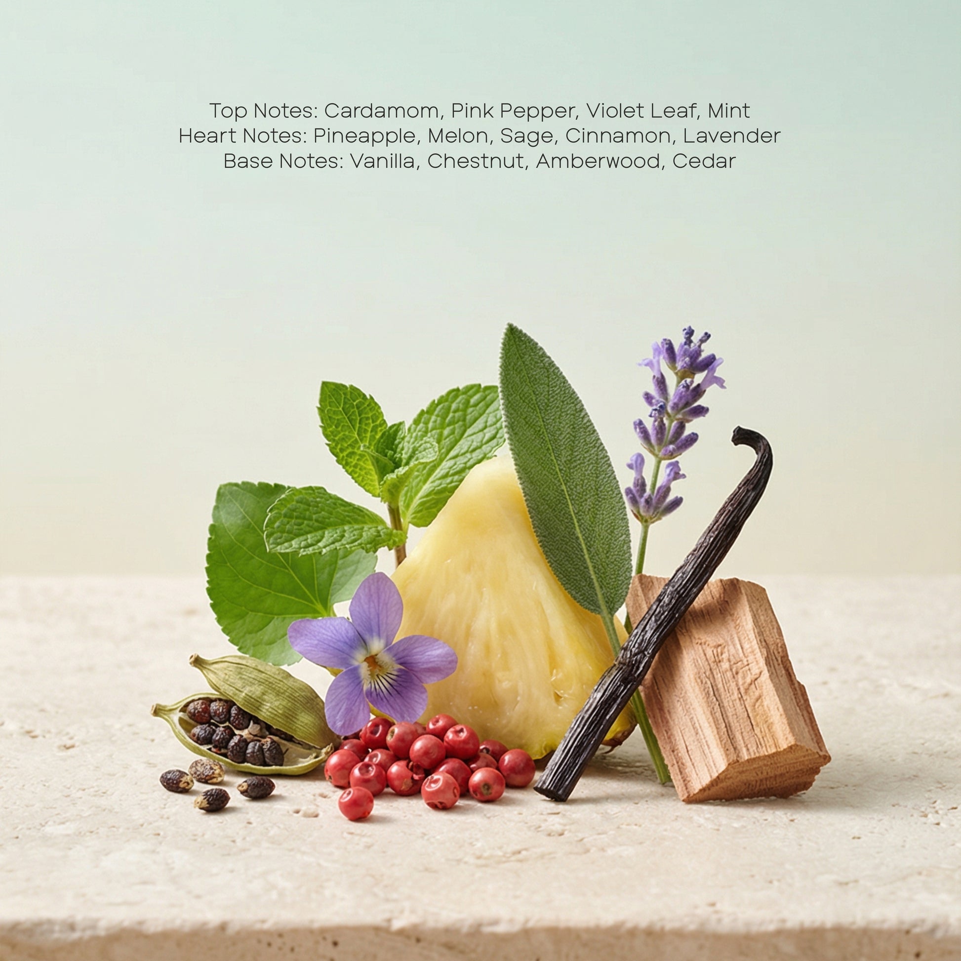 Top Notes: Cardamom, Pink Pepper, Violet Leaf, Mint